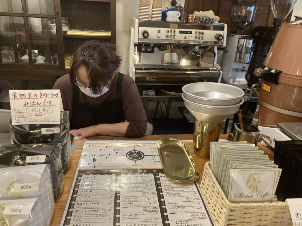 役割分担しておりまして、受注ノートや伝票の作成、それからコーヒー豆袋の準備と出来上がったコーヒー豆の箱詰めがカミさんの仕事。