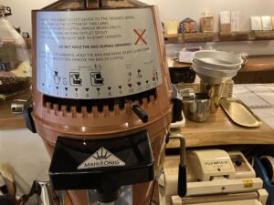 日本製のミルも使用してまして、それは岡町本店に設置しているのですが、粗挽きにする為の目盛りはヨーロッパ製よりかは幅広く、昔は宣伝であった「粗挽きネルドリップ」という言葉が使われたように、日本では粗挽きは割と使用されている挽き具合であります。