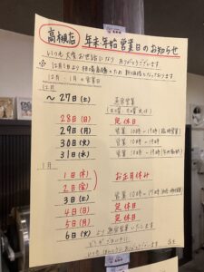 12月27日(土)までは通常営業で定休日はかわらず、28日(日)は定休日でお休み(岡町本店の営業へ行ってきます)、29日(月)が本来ですと定休日でお休みですが、年末ということで臨時で営業します。