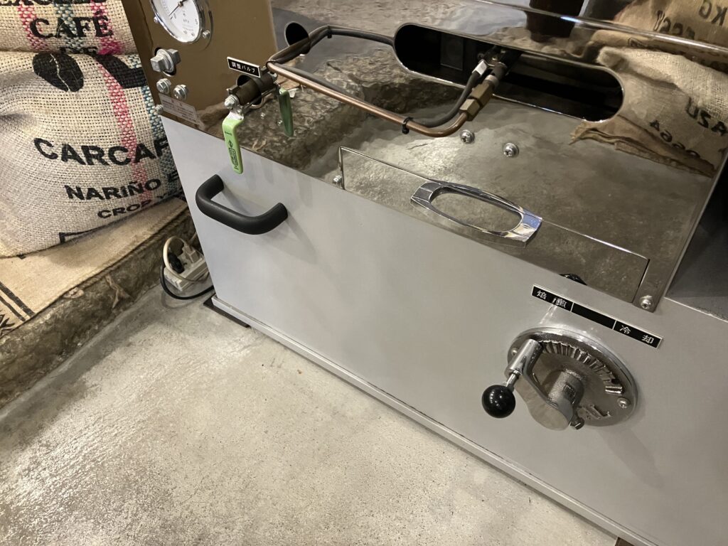 写真は焙煎機ですが、左下の方に黒い取っ手があるその丁度内側に、でっかい排気ファンとそのモーターが配備されています。